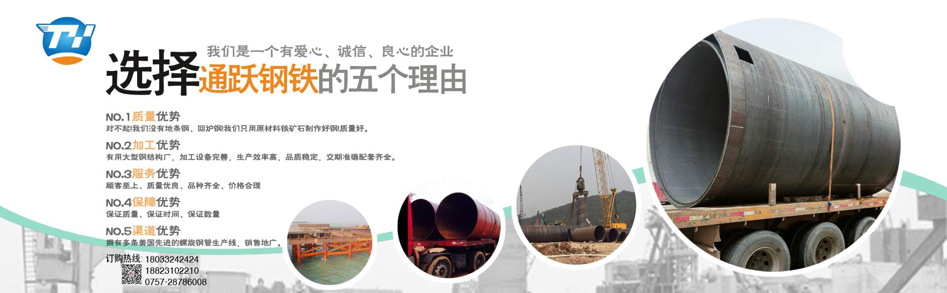 佛山市通躍鋼鐵有限公司 電話180-2228-4448 0757-28786008 擁有多條美國先進的螺旋鋼管生產線,生產直徑φ159-φ3620mm(壁厚6mm-20mm)的雙面埋弧螺旋焊鋼管,年生產能力15萬噸。 生產螺旋管 螺旋鋼管 螺旋焊管 規格厚度6mm-20mm 直徑159mm-3620mm 有多條鋼板卷管機生產規格厚度6mm-70mm 直徑400mm-5020mm 螺旋管 螺旋鋼管 鋼護筒 焊接鋼護筒 鋼板卷管 丁字焊管  加工格構柱 鋼管樁 材質Q235B Q345B Q235A 45# 20# Q420D Q390··· ……